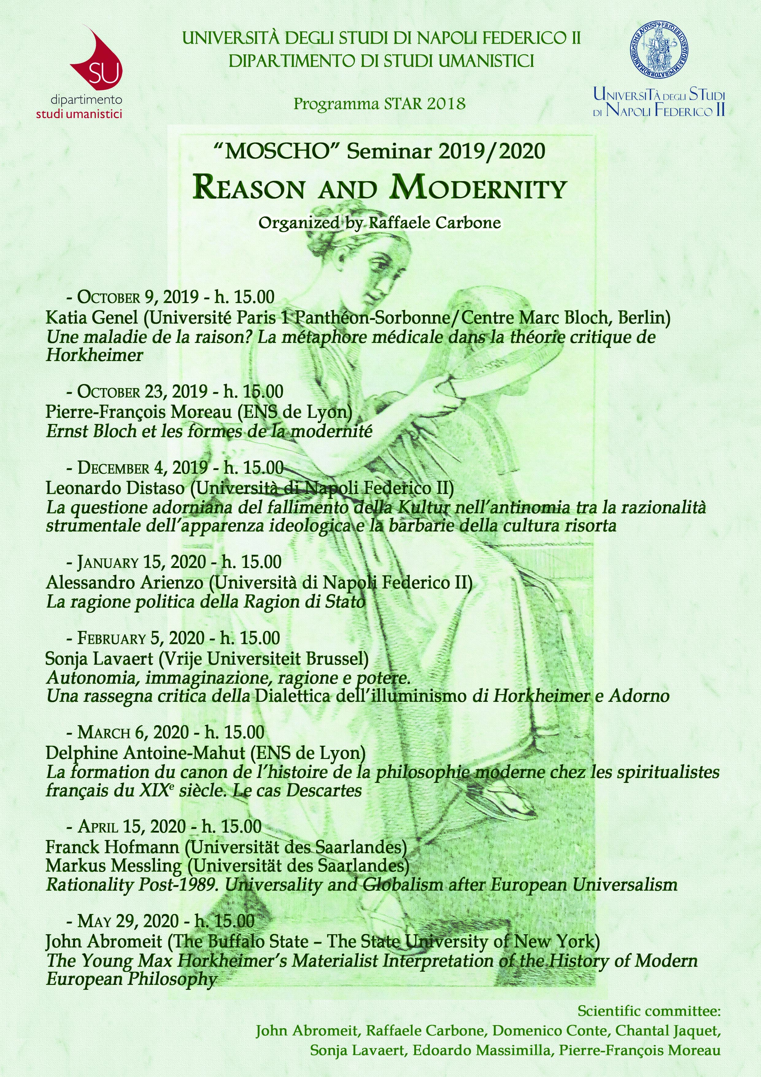 The seminar will focus on “Reason and Modernity”. Ratio is a fundamental notion of philosophy which was interpreted and re-elaborated in different ways by thinkers. It plays a central role in the definition of critical theory within the Institut für Sozialforschung. In summary, it would be interesting to analyse a key concept of modern philosophy (from Montaigne to Kant), its nuances and variations (reason, rationality, rationalization) and its critical reelaboration in the 20th century (the passage from “reason” to “rationalization”) by thematizing the link between the image of modernity shaped by philosophers, historians of philosophy, sociologists, and anthropologists, and the conceptual constellation around the notion of ratio.