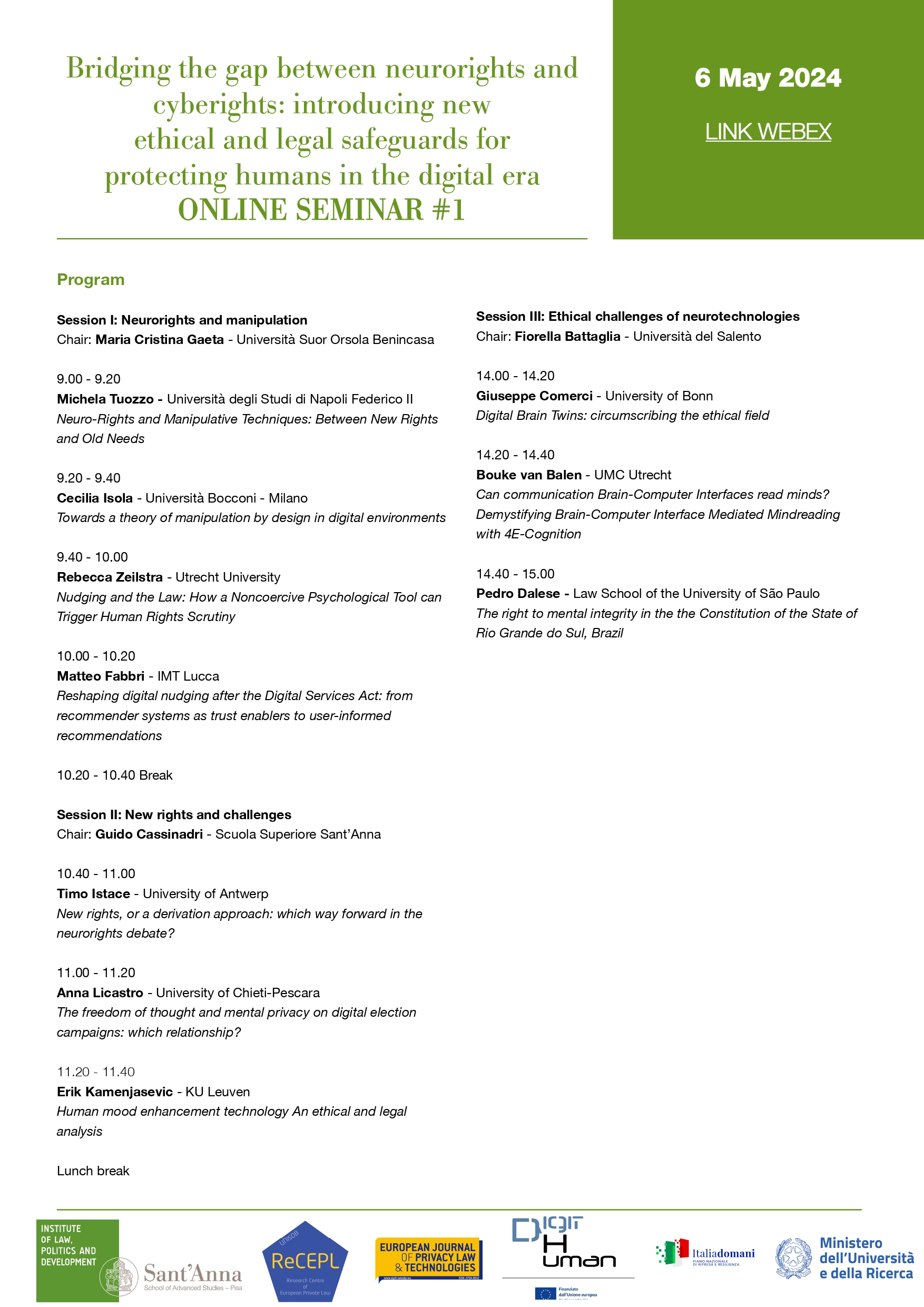 Neuro-rights and Manipulative Techniques: Between New Rights and Old Needs / Tuozzo, Michela. - (2024). (Intervento presentato al convegno Bridging the gap between neurorights anche cyberights: introducing new ethical and legal safeguards for protecting humans in the digital era tenutosi a Online Seminar - Istituto Dirpolis Sant'Anna di Pisa nel 6 maggio 2024).